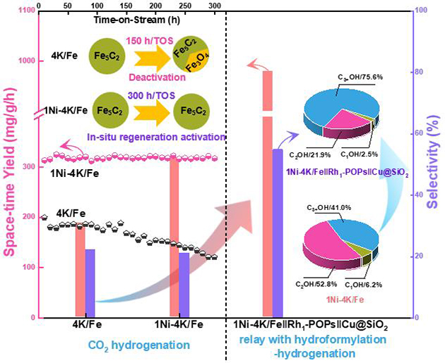 圖2. K-Ni共修飾Fe基催化劑及兩段三催化劑串聯(lián)體系的催化CO2加氫合成C2+OH。