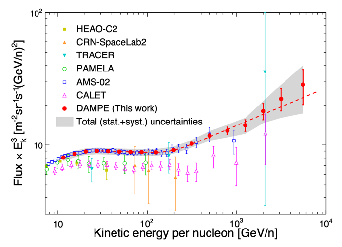 近期,暗物質(zhì)粒子探測衛(wèi)星(DAMPE)“悟空”號國際合作組在高能宇宙線能譜測量方面取得重要進展,獲得了宇宙射線硼元素在10 GeV/n–8 TeV/n的微分通量譜,首次發(fā)現(xiàn)了182 GeV/n附近能譜“硬化”的現(xiàn)象。研究成果發(fā)表于《物理評論快報》(Physical Review Letters)。
