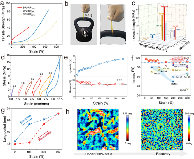 最后,研究人員通過(guò)機(jī)械性能測(cè)試證明,利用動(dòng)態(tài)硬域精準(zhǔn)控制微相分離,成功實(shí)現(xiàn)了聚氨酯彈性體在力學(xué)性能上的調(diào)控,突破了長(zhǎng)期以來(lái)高強(qiáng)度和高彈性無(wú)法兼容的瓶頸。調(diào)控優(yōu)化后的聚氨酯彈性體斷裂強(qiáng)度超過(guò)80MPa以上,該拉伸強(qiáng)度超過(guò)了目前已報(bào)道的大多數(shù)人工合成彈性體。此外,該優(yōu)化的聚氨酯彈性體在短程應(yīng)變下表現(xiàn)出超過(guò)90%的回彈效率,且在長(zhǎng)程應(yīng)變下超過(guò)88%,該回彈效率也超過(guò)了目前所報(bào)道的大多人工合成彈性體,在短程變形時(shí)甚至可與生物彈性蛋白相媲美。