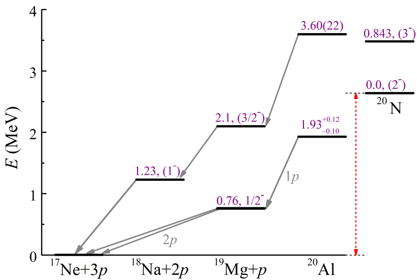 進一步的研究表明,鋁-20基態(tài)通過級聯(lián)的質(zhì)子—雙質(zhì)子發(fā)射的兩步過程進行衰變。作為中間態(tài)的鎂-19基態(tài)具有雙質(zhì)子放射性,它通過同時發(fā)射兩個質(zhì)子衰變?yōu)槟?/span>-17。鋁-20是實驗上發(fā)現(xiàn)的首例具有“子核”雙質(zhì)子放射性的三質(zhì)子發(fā)射核。
