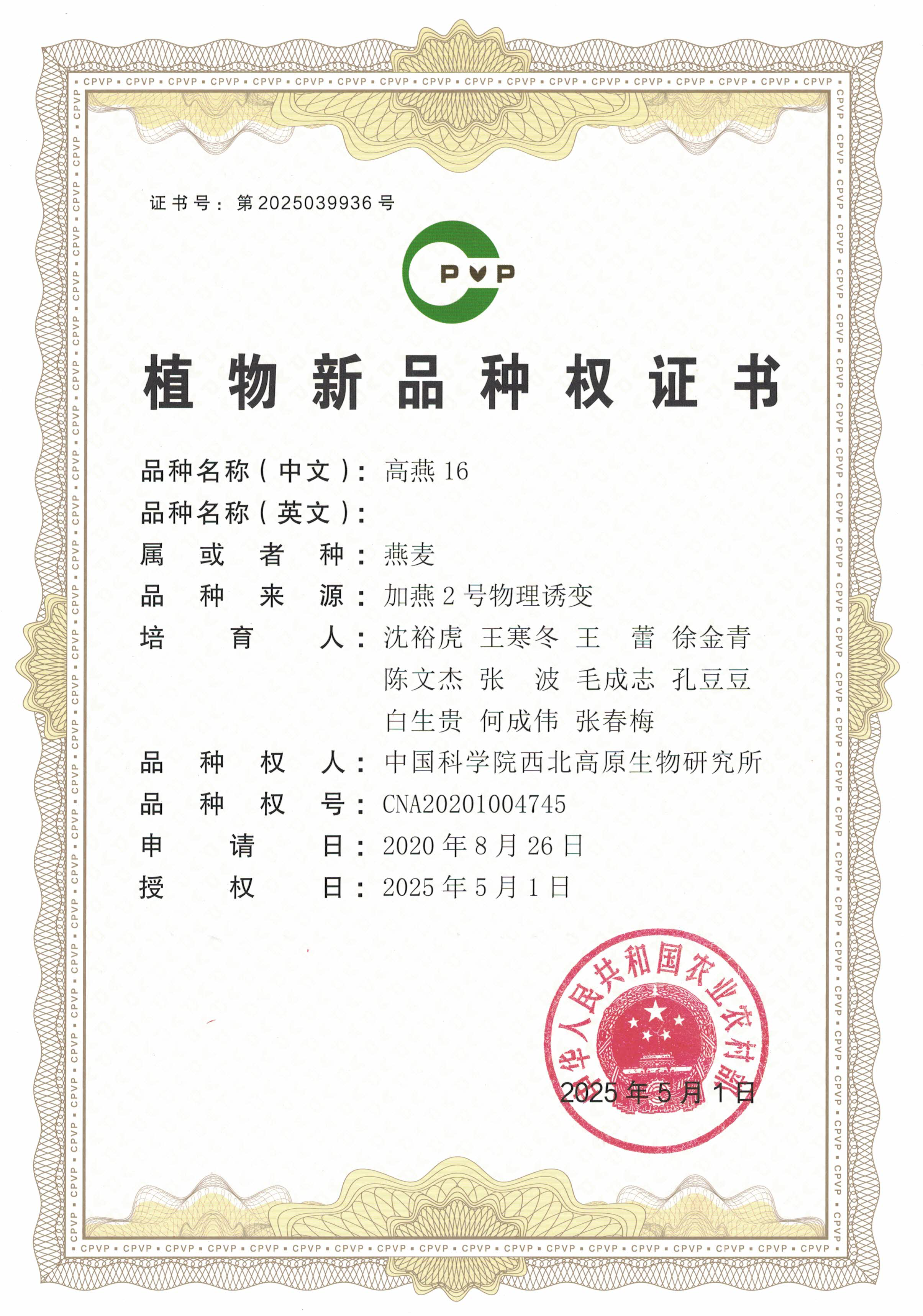 中國(guó)科學(xué)院西北高原生物研究所高原作物種質(zhì)資源創(chuàng)新與利用學(xué)科團(tuán)組培育出的高燕16和高燕17兩個(gè)燕麥新品種于2022年8月22日通過青海省農(nóng)作物品種審定委員會(huì)認(rèn)定備案,兩個(gè)新品種無論是草產(chǎn)量還是在種子產(chǎn)量相較原有燕麥主栽品種均具有較大優(yōu)勢(shì),廣受燕麥草種、飼草生產(chǎn)企業(yè)和專業(yè)合作社的好評(píng)。2022年,兩個(gè)燕麥新品種建立良種繁育基地共1.23萬畝;2023年,兩個(gè)燕麥新品種在青海省海西州、海南州、湟中區(qū)等地示范推廣8.83萬畝;2024年,青海奔盛草業(yè)和互助天佑德青稞酒公司在德令哈市尕海鎮(zhèn)和蓄集鄉(xiāng)分別種植0.7萬畝和0.8萬畝,產(chǎn)量和耐鹽堿能力突出,同時(shí)在青海海南、甘肅山丹軍馬場(chǎng)、西藏日喀則、阿里和新疆伊犁等地也有較大面積種植,2024年度推廣種植達(dá)20.16萬畝。高原作物種質(zhì)資源創(chuàng)新與利用學(xué)科團(tuán)組分別于2020年和2021年申報(bào)兩個(gè)燕麥新品種的國(guó)家植物新品種保護(hù)權(quán),其中高燕16于2025年5月1日獲得正式授權(quán)(品種權(quán)號(hào):CNA20201004745),這是研究所獲得的首個(gè)國(guó)家植物新品種保護(hù)權(quán)。此次品種權(quán)的獲得,為高燕16品種的市場(chǎng)化推廣和科技成果轉(zhuǎn)化提供了堅(jiān)實(shí)基礎(chǔ)。