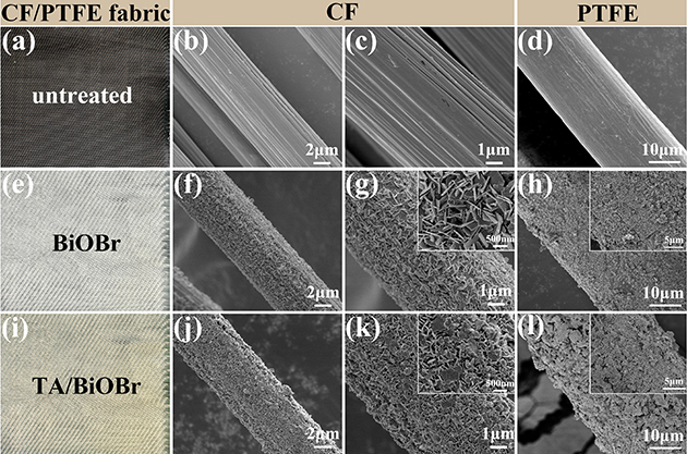 眾所周知,CF和PTFE纖維表面具有強化學惰性,導致其復合材料的界面結合性能差。在上述工作進行摩擦學性能評價的過程中,存在大量纖維與樹脂基體脫黏拔出的現象,對復合材料的整體性能的發(fā)揮產生不利影響。近日,研究團隊基于前期研究基礎,在界面優(yōu)化改性方面提出了新思路。團隊首次將BiOBr應用于摩擦學領域,并提出了“軟-硬-軟”多級結構的設計思路,通過化學浴、水熱生長和層層自組裝方法在CF/PTFE織物表面依次構建了化學交聯的“軟”基底層(PEI/PA)、垂直取向的“硬”中間層(BiOBr納米片)以及動態(tài)配位的“軟”外層(TA/Fe3+金屬-多酚網絡)。其改性前后的纖維表面形貌如圖1所示。