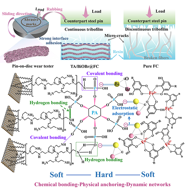 團隊人員在此基礎上提出了在纖維織物表面構建“軟-硬-軟”結構增強復合材料的摩擦學性能的磨損機理。未經改性的復合材料在受到外部擠壓和剪切力的作用下,出現大量的微裂紋并伴隨纖維嚴重拔出斷裂,隨后在對偶表面形成不均勻不連續(xù)的摩擦膜。而TA/BiOBr@FC經由表界面改性,織物界面從微觀到宏觀形成了化學鍵合-物理錨定-動態(tài)網絡的多級增強體系,避免纖維-樹脂界面脫黏和纖維拔出,顯著提升了CF/PTFE纖維織物復合材料的界面性能和摩擦學性能。