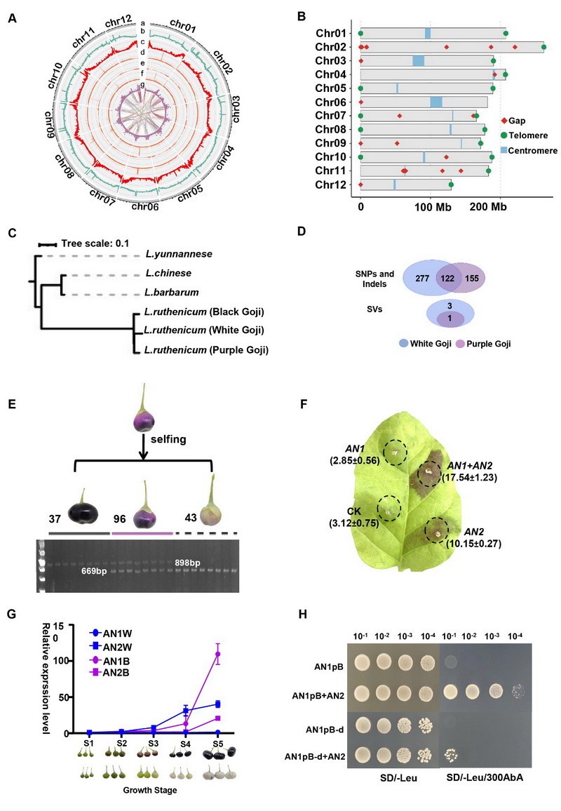 圖?黑果枸杞高質(zhì)量基因組及229 bp AN1 啟動(dòng)子缺失導(dǎo)致果色分化。(A) 染色體基因組特征分布。(B) 缺口、端粒和著絲粒位置。(C) 枸杞屬系統(tǒng)發(fā)育樹(shù)。(D) 白、紫與黑果枸杞間花青素相關(guān)變異。(E) 紫果后代果色分離及基因型鑒定。(F) AN1/AN2 在煙草瞬時(shí)表達(dá)。(G) 白果與黑果 AN1/AN2 表達(dá)動(dòng)態(tài)。(H) Y1H 驗(yàn)證 AN2 與 AN1 啟動(dòng)子的結(jié)合。
