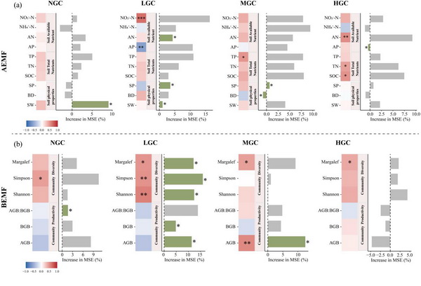 圖1?不同礫石化水平下AEMF與BEMF的相關(guān)性及主要驅(qū)動(dòng)因子重要性分析