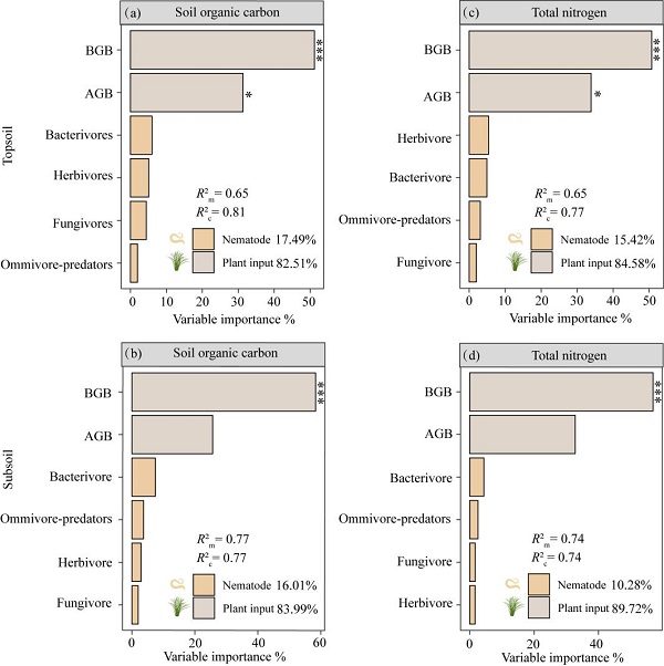 圖3?植物輸入與線蟲營(yíng)養(yǎng)組對(duì)土壤養(yǎng)分變化的相對(duì)重要性
