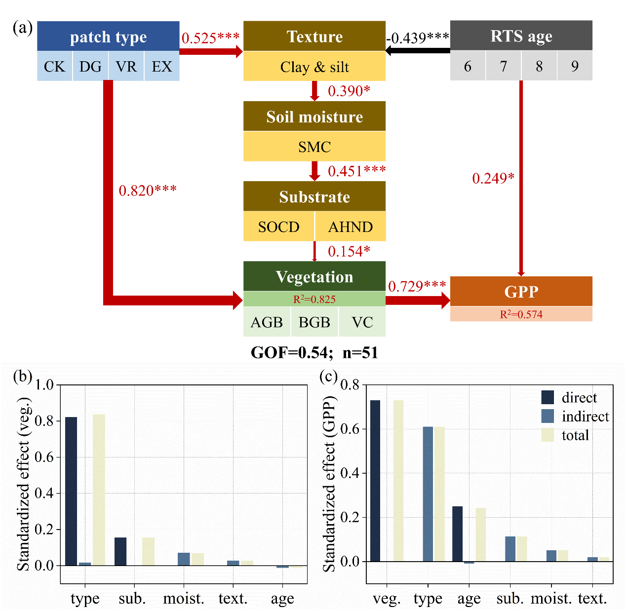 偏最小二乘路徑模型結(jié)果表明,熱融滑塌主要通過“土壤質(zhì)地-水分-基質(zhì)-植被-GPP”路徑影響青藏高原生態(tài)系統(tǒng)功能。其中植被對GPP的直接控制最強(qiáng),滑塌年齡次之,土壤過程則更多通過調(diào)節(jié)群落結(jié)構(gòu)間接作用影響GPP。因此,在評估熱喀斯特地貌的碳效應(yīng)時(shí),應(yīng)將滑塌地表類型及年齡組成納入考量。