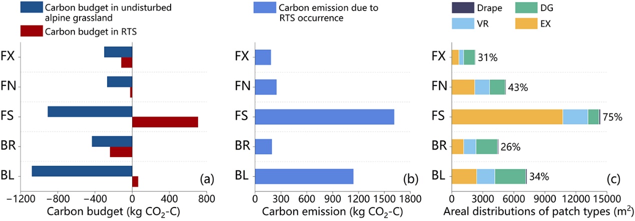 青藏高原是全球最大的高海拔多年凍土區(qū),儲存著大量土壤有機(jī)碳。近年來,隨著氣候變暖、多年凍土廣泛退化,熱融滑塌、熱融溝和熱融湖塘等反映多年凍土快速融化現(xiàn)象的熱喀斯特地貌廣泛發(fā)育,其對高寒生態(tài)系統(tǒng)碳循環(huán)和氣候反饋的影響備受關(guān)注。然而,與熱融溝和熱融湖塘相比,無論是青藏高原還是環(huán)北極多年凍土區(qū),熱融滑塌(retrogressive thaw slumps,RTS)對凍土生態(tài)系統(tǒng)碳動態(tài)的影響都缺乏系統(tǒng)性研究。