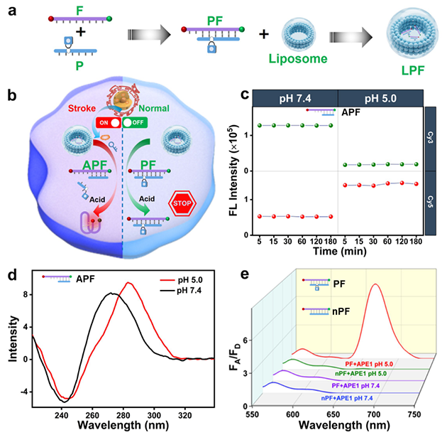 研究團隊以酸性pH響應(yīng)的i-motif結(jié)構(gòu)F鏈為傳感核心,通過與含有APE1酶特異性識別位點的互補“阻斷鏈”P鏈雜交,構(gòu)建可激活型pH探針(PF)。進一步經(jīng)脂質(zhì)體包封形成LPF,顯著提升了其血腦屏障穿透能力及在體穩(wěn)定性。該傳感器僅在APE1高表達(dá)的缺血病灶區(qū)被激活后,才能實現(xiàn)對缺血腦區(qū)pH的高對比度、高特異性比率型成像(圖1)。在腦卒中動物模型中,LPF成功實現(xiàn)了對腦內(nèi)pH梯度的動態(tài)、空間分辨監(jiān)測,清晰勾勒出缺血區(qū)域,展現(xiàn)出優(yōu)異的血腦屏障穿透能力與成像信噪比(圖2)。以上研究為腦卒中早期檢測、機制研究和新藥研究提供了新策略。