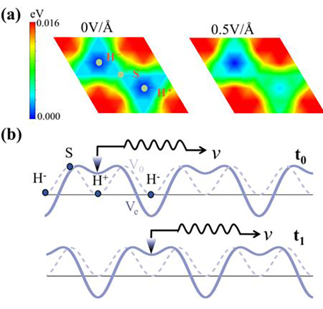 圖2. (a)不同電場(chǎng)下,雙層h-BN的摩擦勢(shì)能面;(b)系統(tǒng)沿最佳滑移路徑(H+→S→H-→S→H+)的勢(shì)能曲線,虛線和實(shí)線分別表示無(wú)外場(chǎng)和施加交變電場(chǎng)的結(jié)果。