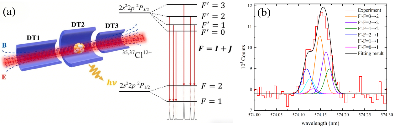 由于高電荷態(tài)離子制備條件苛刻、多電子體系能級結(jié)構(gòu)復(fù)雜,對其開展高精度實驗測量長期面臨較大的技術(shù)挑戰(zhàn)。研究團隊依托高溫超導(dǎo)電子束離子阱(EBIT)實驗平臺,首次成功觀測到類硼氯離子(Cl12+) 中2P1/2和 2P3/2能級的超精細分裂結(jié)構(gòu),并通過高分辨譜線擬合獲得了相應(yīng)的超精細結(jié)構(gòu)常數(shù),利用第一性原理理論計算,成功提取該離子原子核的磁偶極和電四極超精細結(jié)構(gòu)常數(shù)。該工作為中等原子序數(shù)高電荷態(tài)離子超精細結(jié)構(gòu)的理論研究提供了重要實驗基準。