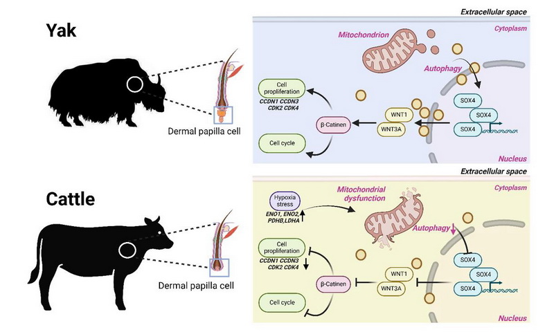 研究團(tuán)隊(duì)進(jìn)一步利用ATAC-seq與ChIP-qPCR發(fā)現(xiàn)了轉(zhuǎn)錄因子SOX4可直接結(jié)合WNT1與WNT3A基因的啟動(dòng)子區(qū)域,且這一結(jié)合對(duì)基因的轉(zhuǎn)錄激活作用通過雙熒光素酶實(shí)驗(yàn)得到驗(yàn)證。SOX4的表達(dá)受自噬水平調(diào)控,激活自噬可挽救SOX4抑制劑對(duì)DP細(xì)胞增殖的抑制作用。該調(diào)控通路在牦牛體中表現(xiàn)出更強(qiáng)的信號(hào)活性,通過促進(jìn)DP細(xì)胞周期進(jìn)程、增強(qiáng)細(xì)胞增殖能力來維持毛囊穩(wěn)態(tài);同時(shí),該通路還能改善線粒體結(jié)構(gòu)完整性以抵御氧化應(yīng)激,從而可能促進(jìn)毛囊生長,系統(tǒng)性增強(qiáng)牦牛對(duì)高原寒冷環(huán)境的生存適應(yīng)能力。總之,研究團(tuán)隊(duì)從單細(xì)胞水平解析了牦牛毛囊適應(yīng)高原寒冷環(huán)境的分子特征,為理解動(dòng)物對(duì)高原極端環(huán)境的適應(yīng)機(jī)制提供了重要基礎(chǔ)數(shù)據(jù)。