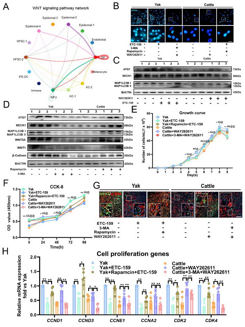 文章代表圖:DP細(xì)胞中自噬與增殖的相互作用由WNT/β-Catenin通路介導(dǎo)。(A)DP細(xì)胞單細(xì)胞數(shù)據(jù)中WNT信號(hào)通路的細(xì)胞相互作用圖。(B)不同處理后牦牛和普通牛DP細(xì)胞的MDA活細(xì)胞染色。(C)牦牛、牦牛+ETC-159、普通牛和普通牛+WAY262611處理組DP細(xì)胞中ATG7、BECN1和LC3I/II的蛋白質(zhì)印跡分析(n=3)。(D) 牦牛、牦牛+3-MA、普通牛和普通牛+雷帕霉素處理組DP 細(xì)胞中ATG7、BECN1、LC3I/II、WNT3A、WNT1和β-Catenin的蛋白質(zhì)印跡分析(n=3)。(E-F)牦牛、牦牛+ETC-159、牦牛+雷帕霉素+ETC-159、普通牛、普通牛+WAY262611和普通牛+3-MA+WAY262611組DP細(xì)胞的生長曲線(n=9)和CCK-8檢測(cè)結(jié)果(n=4)。(G)不同處理組牦牛和普通牛DP細(xì)胞體外培養(yǎng)后PCNA和MKi67的代表性免疫熒光圖像(n=8)。(H)實(shí)時(shí)熒光定量PCR檢測(cè)細(xì)胞增殖相關(guān)基因CCND1、CCND3、CCNE1、CCNA2、CDK2和CDK4的mRNA表達(dá)情況(n=6)