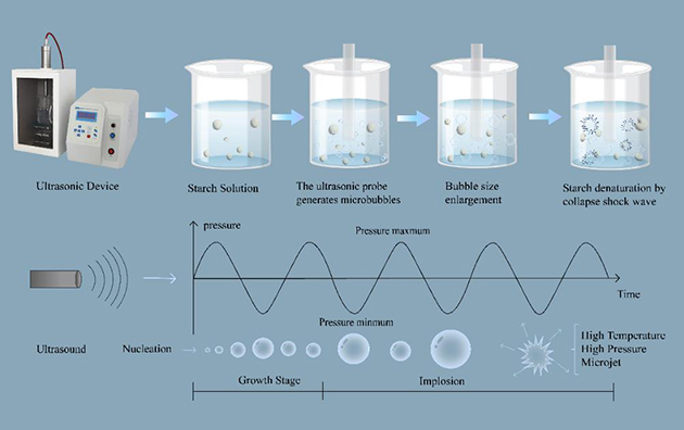 超聲波輔助淀粉改性是一種新興的綠色物理方法,它利用空化效應(yīng)和機械剪切作用破壞淀粉的結(jié)晶區(qū)域,改變顆粒形態(tài),增加比表面積,從而有效提升淀粉的溶解性、親水性和功能特性。相比傳統(tǒng)的化學(xué)和酶法改性方式,超聲波改性避免了化學(xué)試劑的使用及生物催化劑的殘留,更安全且環(huán)保。?