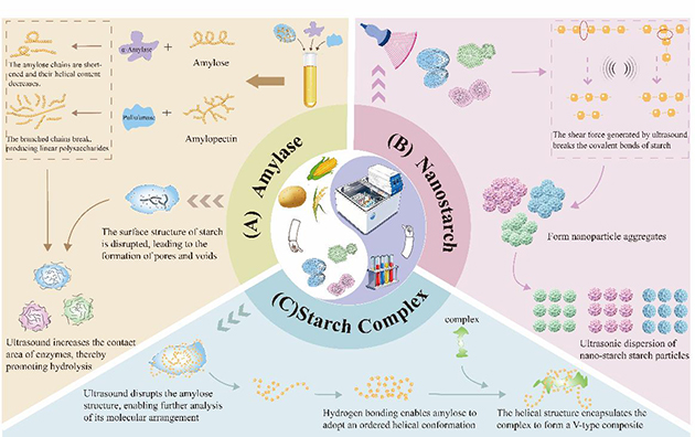 近日,中國科學(xué)院蘭州化學(xué)物理研究所天然藥物與化學(xué)測量研究中心食品化學(xué)與安全檢測團(tuán)隊發(fā)表了關(guān)于抑制淀粉回生方面的綜述文章,系統(tǒng)總結(jié)了超聲波輔助淀粉改性領(lǐng)域的最新研究進(jìn)展,為綠色、高效的淀粉功能化改性技術(shù)提供了重要參考。該論文深入探討了超聲波參數(shù)優(yōu)化、結(jié)構(gòu)-性能關(guān)系解析及協(xié)同改性策略,展現(xiàn)了超聲波技術(shù)在淀粉改性領(lǐng)域的廣闊前景。