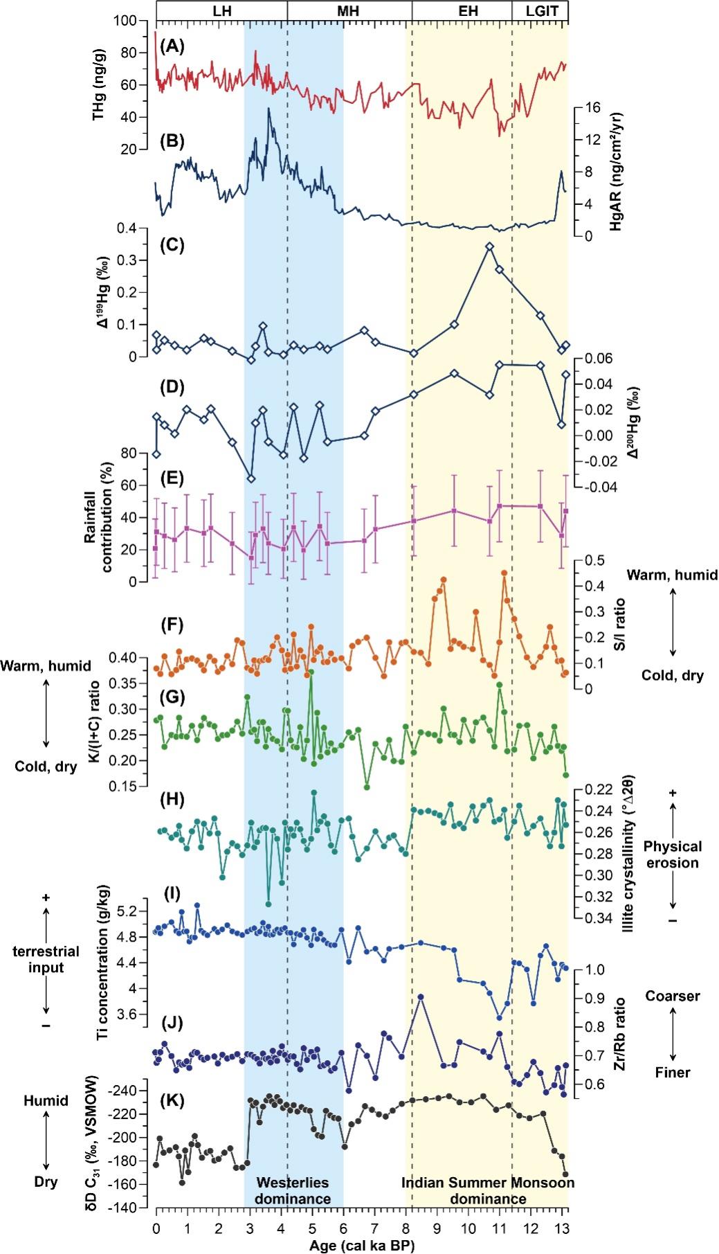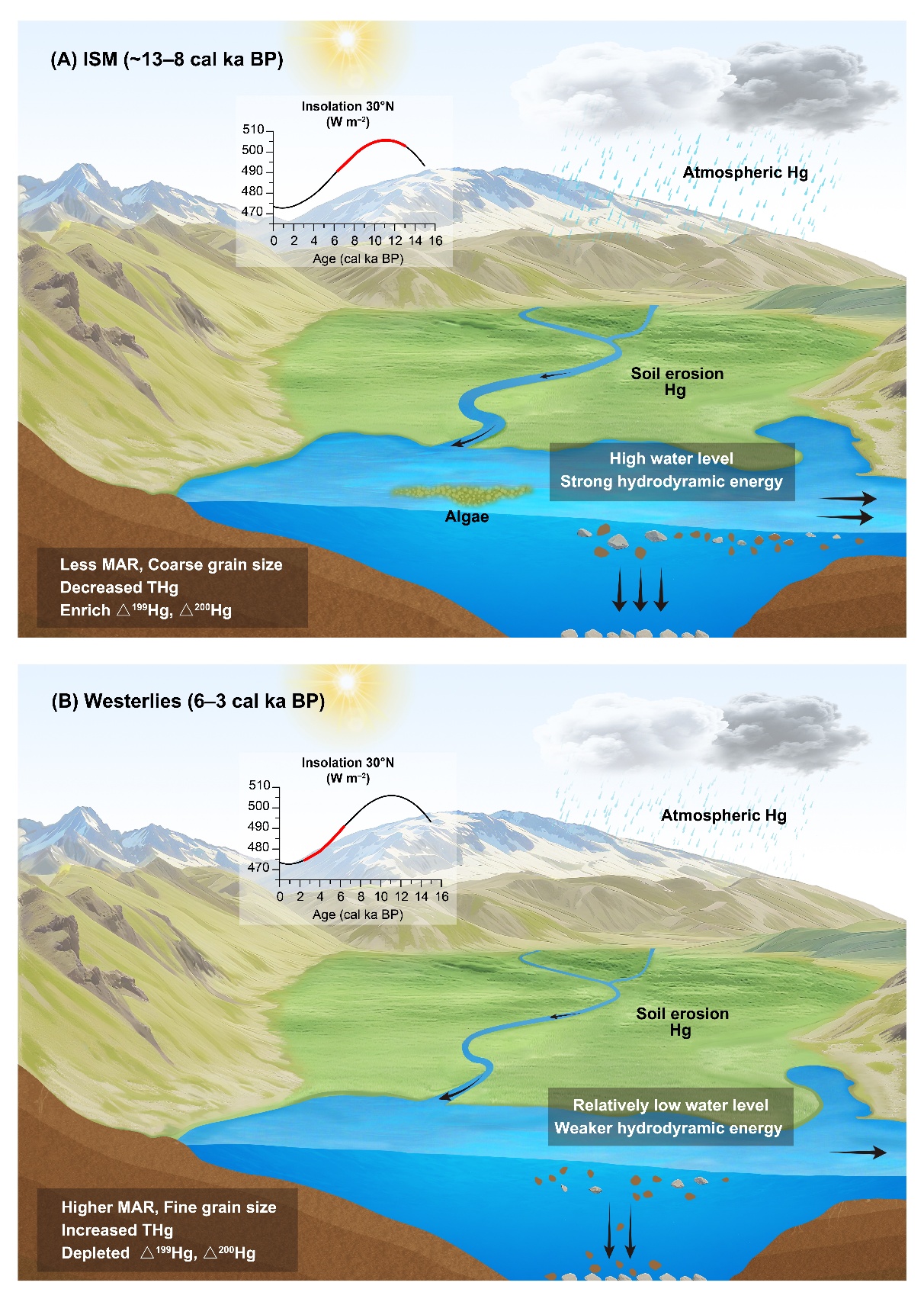 研究發(fā)現(xiàn),錯那湖沉積物中的汞主要來源于大氣降水輸入和流域剝蝕輸入。早全新世時期(~13–8 ka BP),印度夏季風強盛,降水輸入貢獻率相對更高,占比達41 ± 7%,但總汞濃度(52.03 ± 12.74 ng/g)和沉積速率(1.94 ± 1.67 ng/c㎡/yr)均處于較低水平。進入中晚全新世時期(6–3 ka BP),隨著印度夏季風減弱、西風影響增強,降水輸入貢獻比降至26 ± 7%,而汞沉積速率則大幅提升至8.33 ± 3.08 ng/c㎡/yr,較早全新世時期顯著增高。