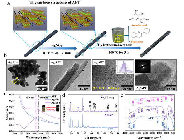 研究人員采用檸檬皮提取物介導的低溫水熱法,利用所含抗壞血酸與多酚類物質將Ag+還原為Ag0,并原位均勻錨定于凹凸棒石納米棒晶表面,構筑了銀納米粒子尺寸小于2 nm的Ag/凹凸棒石復合納米酶(Ag/APT)(圖1)。該礦物復合納米酶比AgNPs具有更大的比表面積和更多的活性位點。對多重耐藥菌性耐甲氧西林金黃色葡萄球菌(MRSA)和產超廣譜β-內酰胺酶大腸桿菌(ESBLs-E.coli)均表現出優(yōu)異的廣譜抗菌活性。