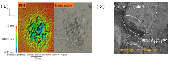 風沙流速為30 m/s,風沙攻角為90°,磨蝕時間為8 min時混凝土磨蝕試件的微觀形貌分析:(a)運動結(jié)構(gòu)重建(SfM)獲得三維表面形態(tài);(b)掃描電鏡(SEM)二維表面分析