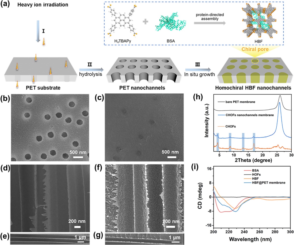 近日,中國科學(xué)院近代物理研究所重離子科學(xué)與技術(shù)全國重點(diǎn)實(shí)驗(yàn)室材料研究中心與蘭州大學(xué)化學(xué)化工學(xué)院、東江實(shí)驗(yàn)室合作,在手性分離膜研究方面取得重要進(jìn)展。研究團(tuán)隊(duì)依托蘭州重離子加速器(HIRFL)提供的重離子輻照技術(shù),成功制備出一種具有同手性特征的氫鍵生物雜化框架核孔膜(HBF@PET),實(shí)現(xiàn)了對氨基酸對映體的高效、精準(zhǔn)分離。相關(guān)成果于近日發(fā)表在國際化學(xué)期刊《美國化學(xué)會志》(Journal of the American Chemical Society)上。
