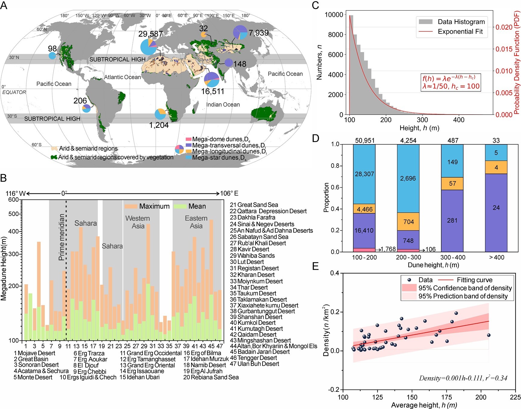 研究發(fā)現(xiàn),全球97%以上高大沙山集中于撒哈拉沙漠與亞洲干旱區(qū),充足沙源與強(qiáng)勁風(fēng)力是沙山發(fā)育的基礎(chǔ)條件;澳大利亞沙漠因植被覆蓋度高、輸沙量有限,而未發(fā)育沙山。全球近91%的沙山高度介于100–200米,且以星狀沙山為主,表明多向風(fēng)況更利于沙山的形成;高度超300米后以橫向沙山為主,超過(guò)400米的沙山僅有33座。空間上,大陸內(nèi)部沙丘場(chǎng)沙山平均高度更高且沙山密度隨沙山平均高度升高而顯著增加。