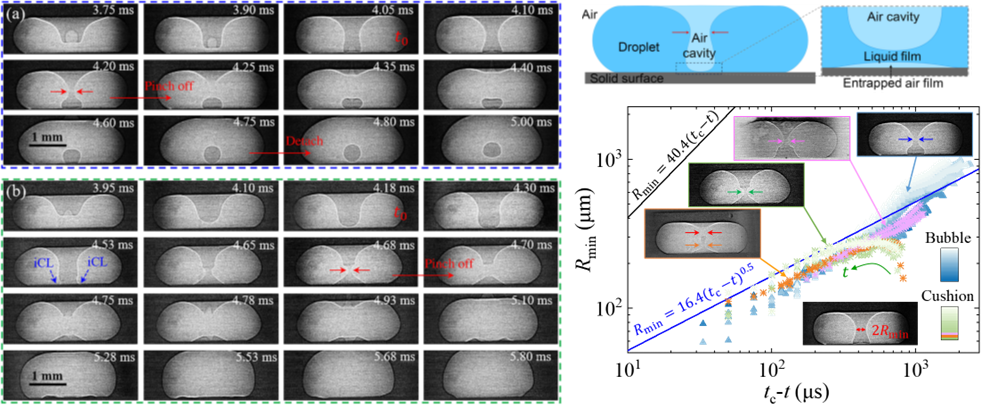 固液界面相互作用涉及典型的多尺度界面現(xiàn)象與流動過程,液滴撞擊固體表面時會沿中心軸產生圓柱形氣腔,并在液滴下方捕獲一層空氣薄膜。傳統(tǒng)觀點認為這層氣膜在影響撞擊結果中起關鍵作用。之前的研究僅發(fā)現(xiàn)慣性主導的軸向內爆導致氣腔夾斷并演化為氣泡,而對不形成氣泡的情況并不清楚,對氣腔與氣膜的相互作用也不了解。由于動態(tài)液滴中存在多個液氣界面和復雜的構型變化,傳統(tǒng)光學成像方法無法深入解析多界面動力學。