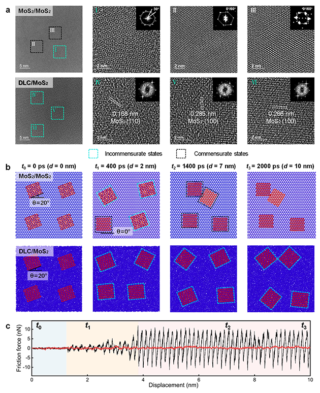 超潤(rùn)滑工程尺度實(shí)現(xiàn)面臨三大核心挑戰(zhàn),即大尺度接觸面的隨機(jī)無序性導(dǎo)致超潤(rùn)滑失控、高接觸壓力下界面形變導(dǎo)致超潤(rùn)滑失效、大氣環(huán)境活性氣氛引發(fā)界面摩擦化學(xué)反應(yīng)導(dǎo)致超潤(rùn)滑失穩(wěn)。針對(duì)上述挑戰(zhàn),研究團(tuán)隊(duì)從“宏觀接觸-微納界面-分子構(gòu)型-原子晶格”跨尺度結(jié)構(gòu)進(jìn)行逐級(jí)設(shè)計(jì)。首先,基于歸一化接觸思想,通過激光織構(gòu)構(gòu)建規(guī)則的接觸陣列,將宏觀面接觸歸一化為無數(shù)等同的微米級(jí)單元接觸,使每個(gè)單元的接觸狀態(tài)(面積、形狀、 受力等)保持一致,這樣界面潤(rùn)滑材料在同一接觸狀態(tài)下結(jié)構(gòu)變化也趨于一致,整體變得可控(圖1);其次,在每個(gè)接觸單元表面構(gòu)筑剛性非晶類金剛石碳(DLC)膜層/柔性晶體MoS2配副滑移元界面,剛?cè)峤Y(jié)合有力削弱接觸界面在極端高接觸壓力下的形變;進(jìn)一步采用MXene作為增強(qiáng)與錨定劑,使晶體MoS2在極端高接觸壓力和大氣環(huán)境下保持完整的層狀結(jié)構(gòu),減少了缺陷與邊緣的不利影響,賦予其抵抗水分子和氧氣氧化能力,從而維持超潤(rùn)滑界面的穩(wěn)定。最后,揭示了運(yùn)動(dòng)過程中原子晶格匹配的動(dòng)態(tài)偏轉(zhuǎn)微觀機(jī)制(圖2),即非公度態(tài)向公度態(tài)轉(zhuǎn)化,發(fā)現(xiàn)了非晶DLC/晶體MoS2永久非公度接觸特性,從根本上消除了晶格匹配所導(dǎo)致的原子互鎖。