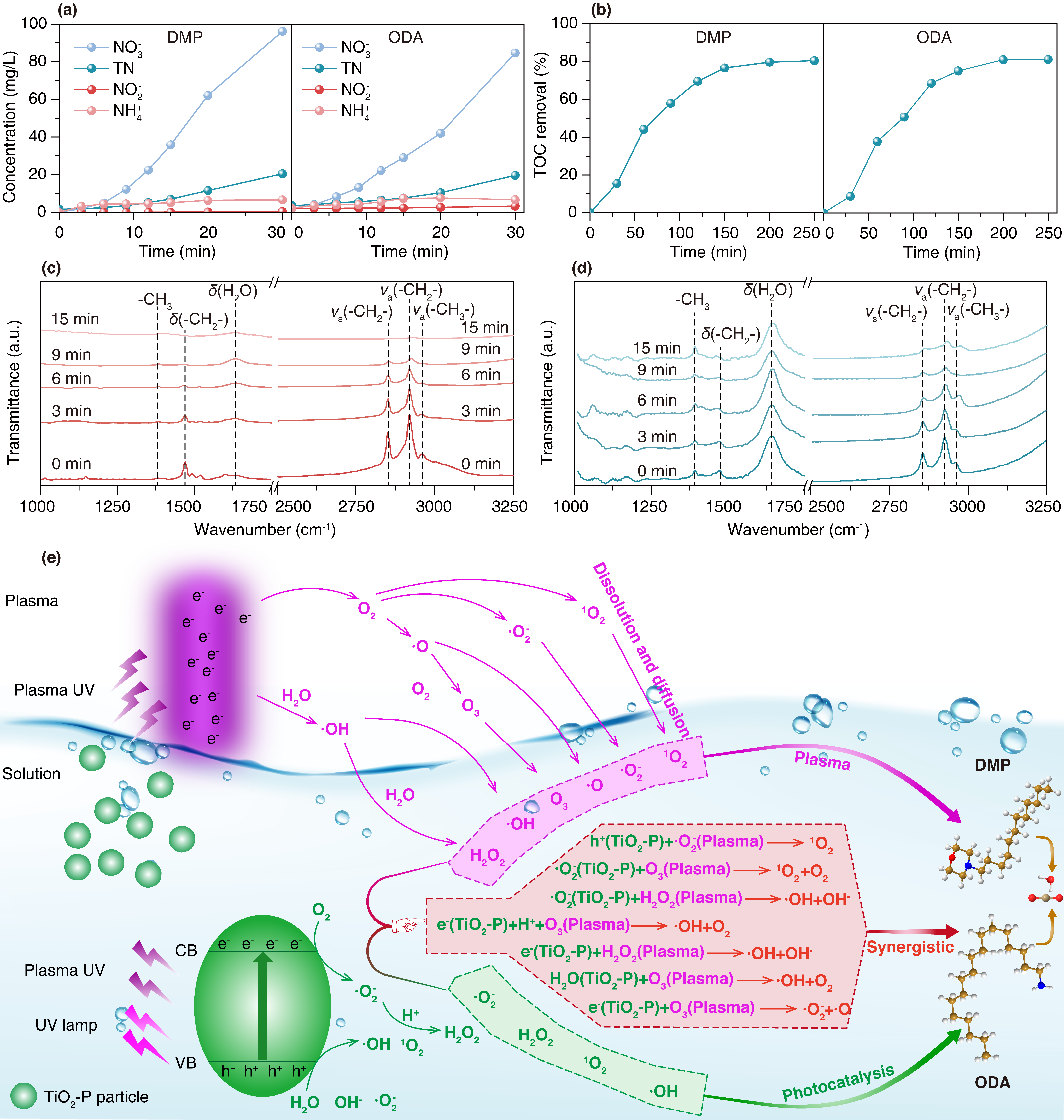 高鹽工業(yè)廢水中常含有難降解有機(jī)污染物,鹽分又會顯著抑制活性氧物種作用效率,導(dǎo)致高級氧化過程處理效果下降,因此高鹽有機(jī)廢水治理一直是環(huán)境工程領(lǐng)域的技術(shù)難點。針對鉀鹽浮選尾鹽中十八胺(ODA)和十二烷基嗎啉(DMP)典型浮選藥劑難以高效去除的問題,研究團(tuán)隊構(gòu)建了一種非熱等離子體與光催化串聯(lián)協(xié)同體系,并通過等離子體誘導(dǎo)缺陷工程策略制備出富含表面氧空位和Ti3?活性位點的TiO2光催化材料(TiO2-P),實現(xiàn)了真實高鹽尾礦鹵水中有機(jī)污染物的快速高效降解。