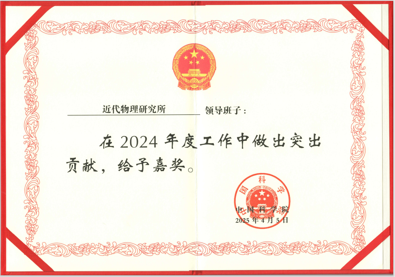 近日,中國(guó)科學(xué)院印發(fā)了2024年度領(lǐng)導(dǎo)班子和領(lǐng)導(dǎo)人員考核優(yōu)秀予以獎(jiǎng)勵(lì)的決定。中國(guó)科學(xué)院近代物理研究所領(lǐng)導(dǎo)班子、所長(zhǎng)孫志宇、副所長(zhǎng)何源榮獲2024年度中國(guó)科學(xué)院嘉獎(jiǎng)。