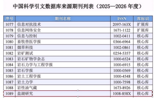 8月7日,中國科學(xué)院文獻(xiàn)情報中心公布了中國科學(xué)引文數(shù)據(jù)庫(CSCD)2025 —2026 年來源期刊遴選結(jié)果,由中國科學(xué)院青海鹽湖研究所主辦的《鹽湖研究》成功入選 CSCD 來源期刊核心庫。這一成績標(biāo)志著《鹽湖研究》在學(xué)術(shù)質(zhì)量、影響力和期刊規(guī)范化建設(shè)等方面獲得了國內(nèi)權(quán)威機(jī)構(gòu)的高度認(rèn)可,實(shí)現(xiàn)了期刊發(fā)展的重大突破。