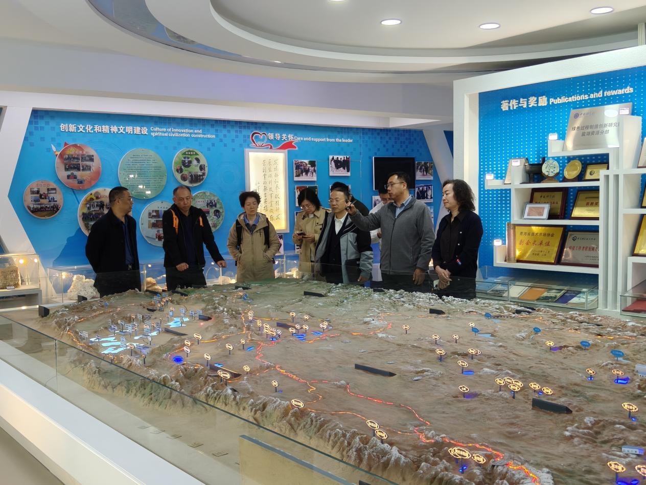 蔡方偉一行參觀了青海鹽湖所科技成果展廳,對青海鹽湖所的歷史沿革、科研平臺、人才隊伍、科研成果、重大歷史貢獻(xiàn)和鹽湖資源開發(fā)利用研究進(jìn)展等情況進(jìn)行了解。