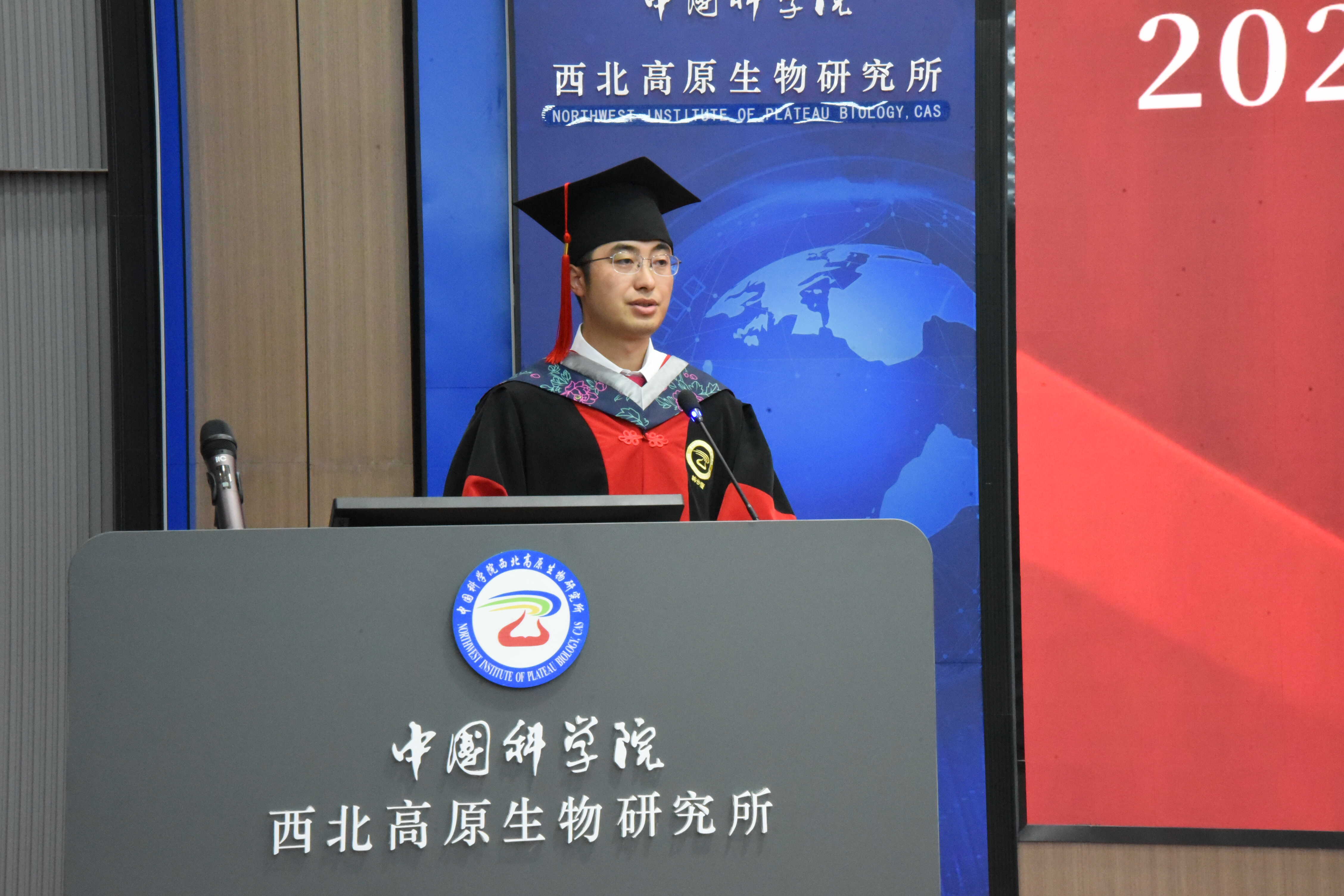 畢業(yè)典禮在莊嚴的國歌聲中拉開序幕。優(yōu)秀畢業(yè)生代表韓步鷹博士首先發(fā)言,他代表全體畢業(yè)生向培養(yǎng)他們的研究所和辛勤付出的導師們送上了最真摯的謝意和最美好的祝福。他說:“夏至是太陽北行的轉折點,亦是畢業(yè)生們的轉折點。畢業(yè)不是終點,而是新的起點。未來,同學們將肩負更大的責任和使命,繼續(xù)在各自的領域中發(fā)光發(fā)熱”,并莊嚴承諾,無論未來身處何地,全體畢業(yè)生都會銘記在西北高原所學到的知識和“牦牛精神”,不忘初心,砥礪前行。