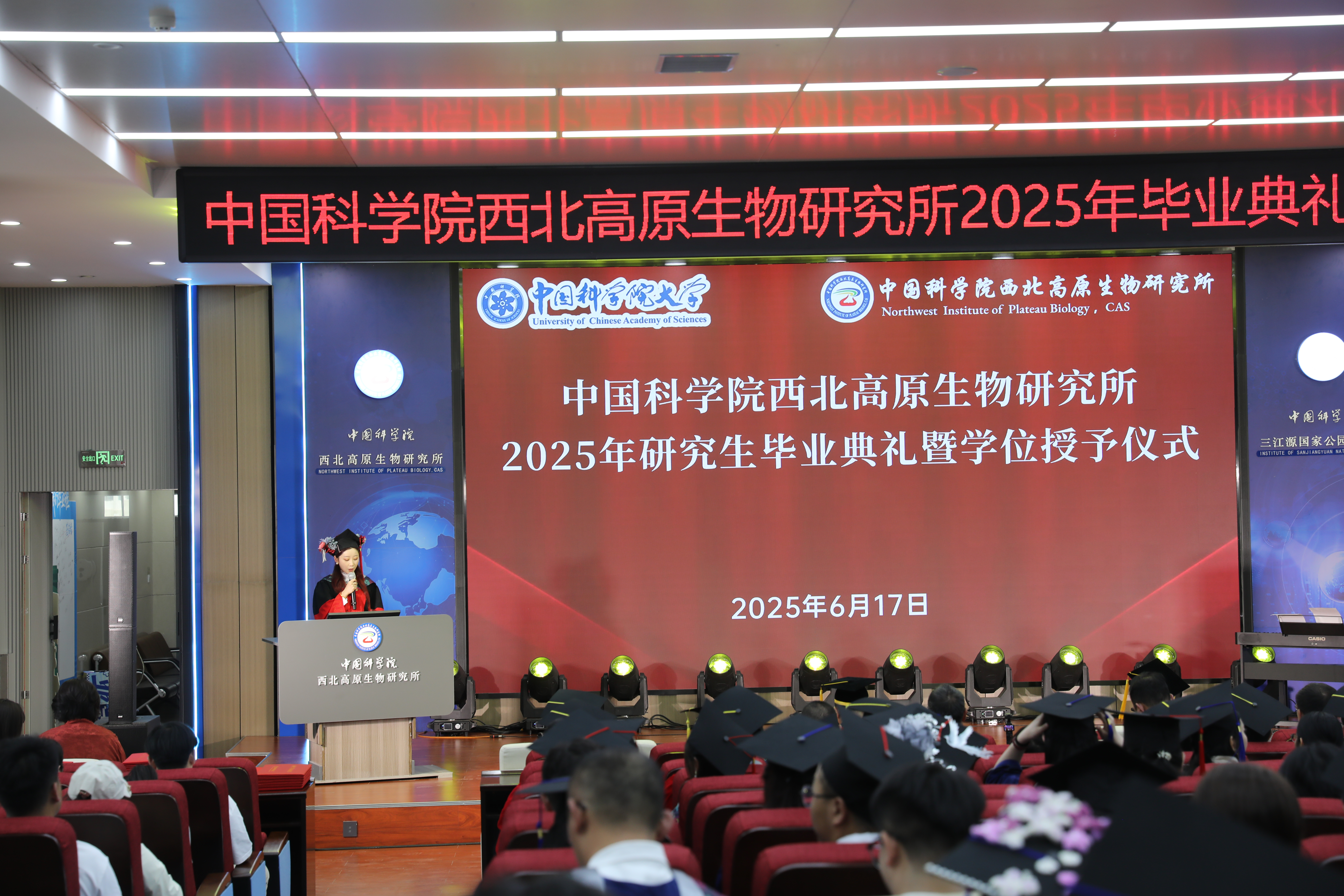 6 月 17 日,中國科學(xué)院西北高原生物研究所在 1 號樓學(xué)術(shù)報告廳隆重舉行2025年研究生畢業(yè)典禮暨學(xué)位授予儀式。西北高原所所長、黨委書記陳世龍,副所長楊其恩,全體畢業(yè)生導(dǎo)師,2025 屆全體畢業(yè)生及畢業(yè)生家長代表,在讀研究生共200余人齊聚一堂,共同見證這一重要時刻。