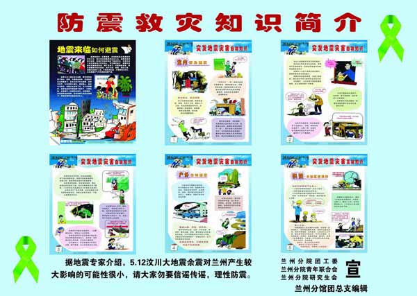 為正確引導(dǎo)廣大團(tuán)員青年堅(jiān)定信心,沉著應(yīng)對(duì)地震災(zāi)害,防止地震謠言的傳播和擴(kuò)散,維護(hù)良好的社會(huì)秩序和有序的工作環(huán)境,蘭州分院團(tuán)工委會(huì)同蘭州分院青年聯(lián)合會(huì)、研究生會(huì)迅速組織力量編輯制作了《中國(guó)科學(xué)院蘭州分院防震抗震知識(shí)讀本》和“防震救災(zāi)知識(shí)簡(jiǎn)介”宣傳畫(huà),并在蘭州分院各單位分發(fā)、宣傳,特別是在科學(xué)院中學(xué)和小學(xué)大范圍發(fā)放和張貼,有效加強(qiáng)了中小學(xué)生的防震抗震知識(shí)和緊急逃生救護(hù)常識(shí),受到有關(guān)方面的歡迎,取得了良好的社會(huì)效益。